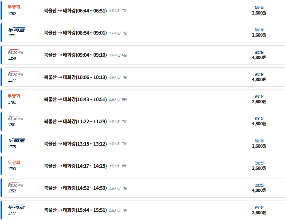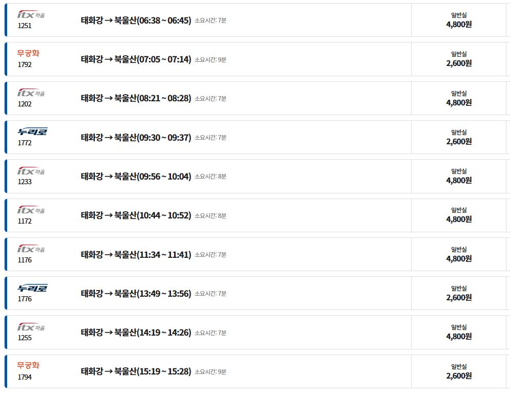 태화강- 북울산역 기차 시간표입니다.