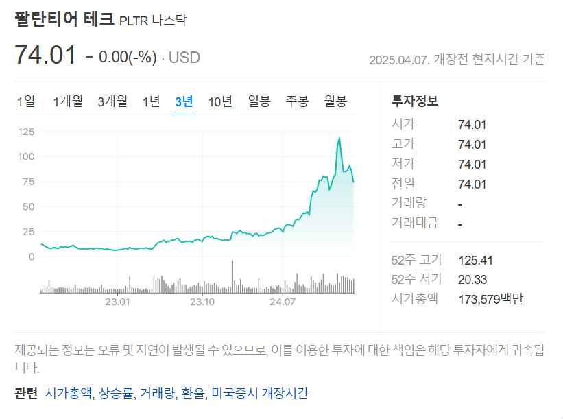 2025년 4월 4일 기준, 팔란티어 주가는 $74.01로 마감했습니다.